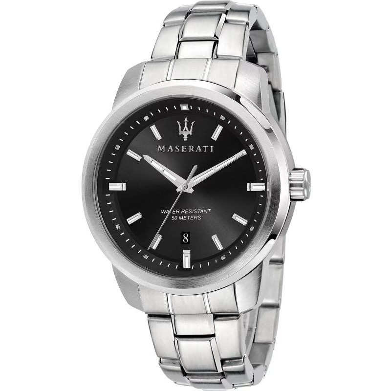 Brand: Maserati; Collection: Successo; Product code: R8853121006; Type of article: Wristwatch; Gender: Man; Functions: Time, Date; Type of Movement / Mechanism: Quartz SEIKO VJ42 (Battery); Case Shape: Round; Case Material: Stainless Steel; Case Color: Silver; Case Diameter Ø: 44 mm; Type of Dial: Analog; Color of the Dial: Black; Strap Material: Stainless Steel; Strap Color: Silver; Water Resistance: 50 meters - 5 bar.
